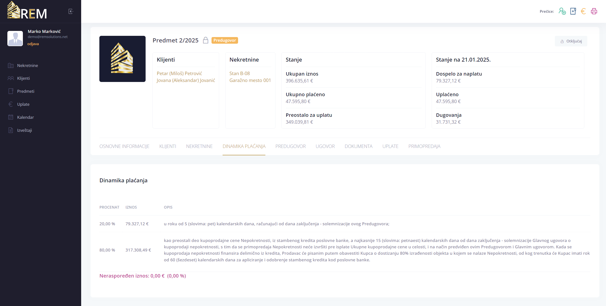 Modul Prodaja obuhvata sve ključne aspekte upravljanja prodajnim procesom, od kreiranja predmeta (klijenti, proizvodi, uslovi plaćanja) do izdavanja konačnih dokumenata. Omogućava pretragu predmeta, generisanje predugovora i ugovora, praćenje uplata kroz avansne račune, izdavanje konačnih računa, potvrda o isplati i zapisnika o primopredaji, kao i integraciju sa fiskalnom kasom. Uz to, sadrži Document Management System koji omogućava kreiranje i skladištenje svih klijentovih dokumenata.