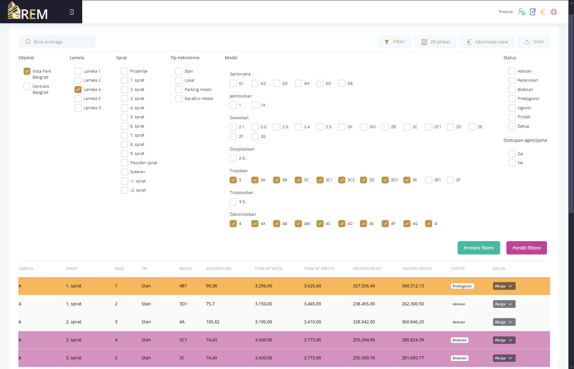 Modul Proizvodi omogućava hijerarhijsko kreiranje i upravljanje proizvodima, od placa i parcele do konkretnih jedinica poput stanova, lokala, garaža, garažnih mesta i parking mesta. Sistem podržava unos, izmenu i brisanje svih elemenata hijerarhije, uz intuitivan 2D vizuelni prikaz stanova organizovan po hijerarhijskim celinama i njihovom statusu. Modul obezbeđuje pretragu proizvoda prema različitim parametrima, uključujući strukturu, kvadraturu, orijentaciju, lokaciju i status.